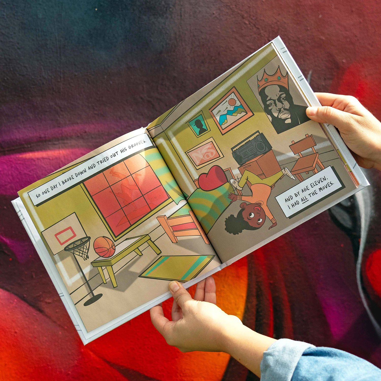 Available here with signature and hand-drawn personalization. This is the original format. Sturdy, gift-ready and made to last. My Hip Hop Story introduces kids to the four elements of Hip Hop through rhyme, rhythm and bold illustration. It’s more than a book. It’s a keepsake. Each hardcover is signed by the artist and includes the option to add a personalized name, hand-drawn in graffiti lettering on the “This Book Belongs To” page. Only available through this site.